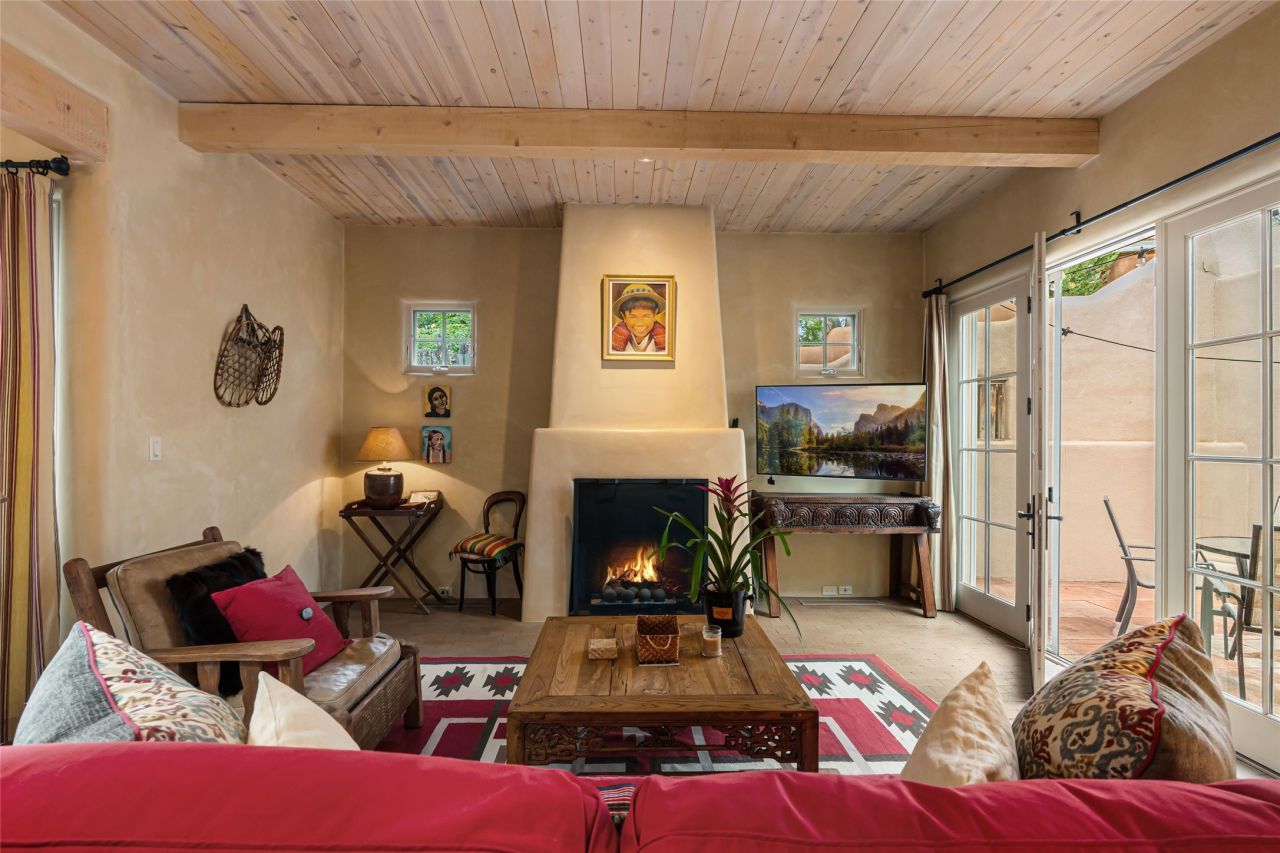 Los Perales is a pear tree covered hillside in the historic district, corner of Palace Avenue and Cerro Gordo with three beautiful units designed and built by internationally renowned architect Michael Mahaffey. Great location, wonderful finishes! This lovely Unit B includes two well separated bedrooms and baths that flank the central living areas with gorgeous hand, troweled plaster walls; lovely pickled high, beamed ceilings; tumbled travertine marble baths; private, lovely, entertaining courtyards outside. The intelligent floor plan is elegant and livable! There is plenty of parking and the property is an easy stroll to the plaza, Canyon Road, the river, and the museum District. Walk home in the moonlight in 3 minutes from The Compound, Geronimo, and El Farol!